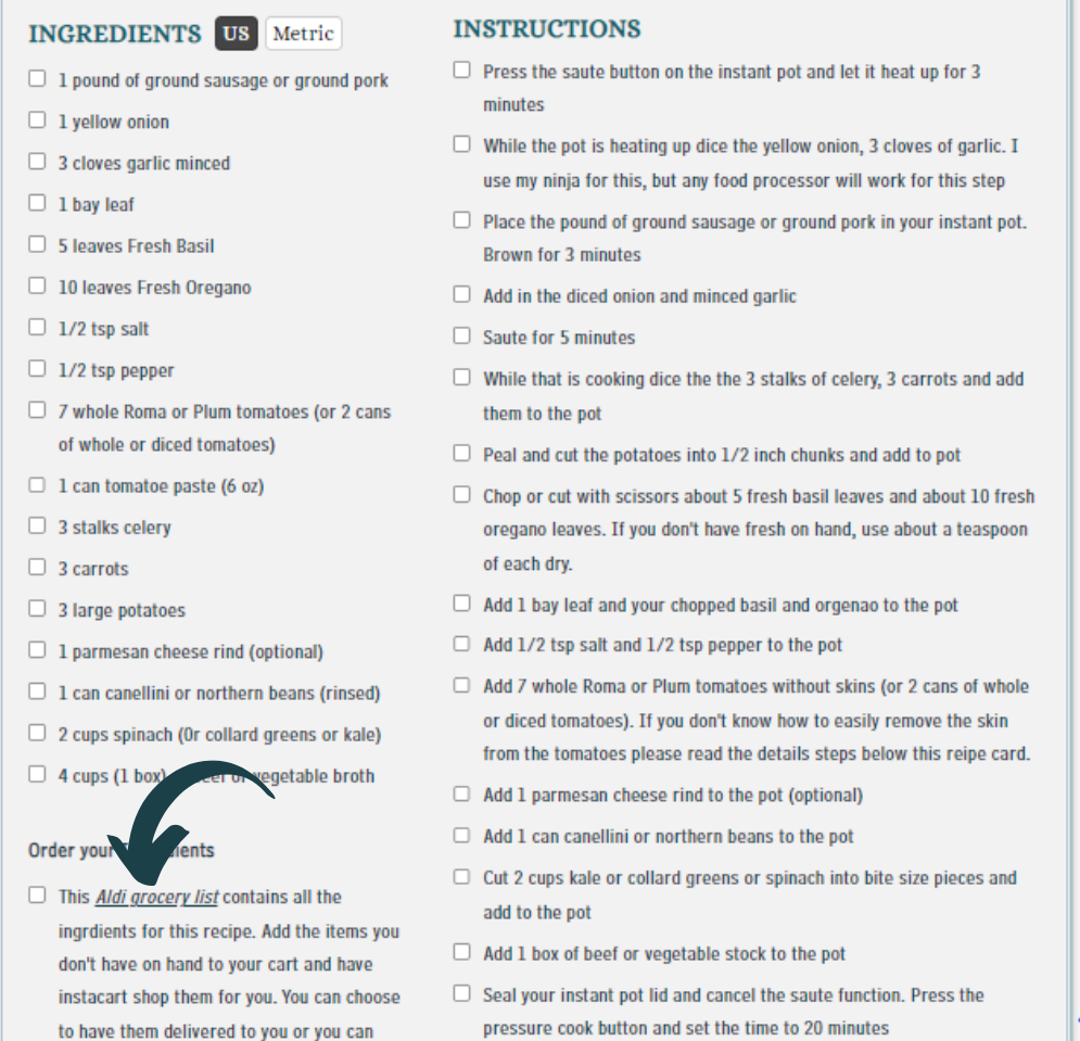 When you are looking at your meals recipe you will see a section titled “Aldi Grocery List” ( shown to the right )